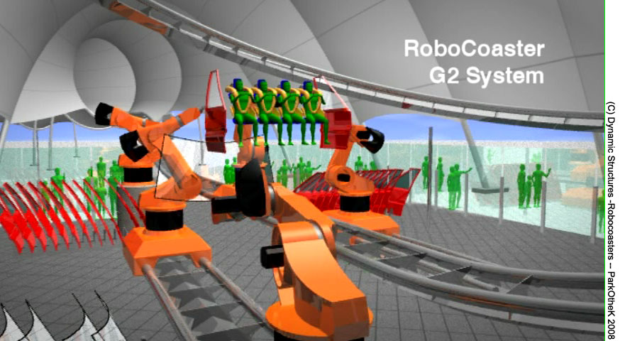 Cette technologie robotique a été développée par l’industriel allemand Kuka, un des leaders de la fabrication de bras-robots pour les chaînes de montages automobile. Les Robocoasters ont fait leur apparition en Europe, à Legoland Billund au Danemark en 2003. Plus récemment en France, le Futuroscope en a acheté 10 en 2006. D’un coût unitaire de 300.000 Euros, chaque robot impressionne tant par ses sensations que par son aspect spectaculaire.